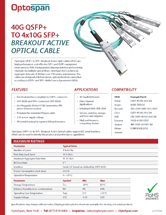 OptoSpan QFSP+ to SFP+ Breakout Active Optic Cables (AOC) are high performance, cost-effective SFP+ and QSFP+ equipment interconnects. With 4 independent data transmission and receiving channels via multiple optical fibers, OptoSpan AOCs achieve an aggregate data rate of 40Gbps over 100 meters transmission. The cables are designed with form factor, optical/electrical connection according to QSFP+ and SFP+ Multi-Source Agreements (MSA).