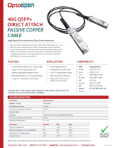OptoSpan Direct Attach Passive Copper Cables offer high performance, cost-effective connectivity at 40G rates. With 4 independent data transmission and receiving channels, OptoSpan cables achieve an aggregate data rate of 40Gbps over 100 meters transmission. The cables are designed to be fully compatible in form factor and optical/electrical connection according to QSFP Multi-Source Agreement (MSA).