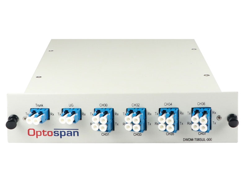 OptoSpan DWDM-T08SUL-000 system provides the most robust and low-cost bandwidth upgrade for your current fiber optic communication networks. All our DWDM systems are based on thin film filter technology and metal bonding micro optics packaging. OptoSpan provides high quality DWDM with flat channel bandwidth, flexible channel configuration, low insertion loss and high isolation. All OptoSpan products are epoxy-free in the optical path. Each DWDM-T08SUL-000 can transmit and receive up to 8 connections of different standards, data rates or protocols over one single fiber optic link without disturbing each other. Each DWDM module supports ESCON, ATM, Fibre Channel, and Gigabit Ethernet over each port.