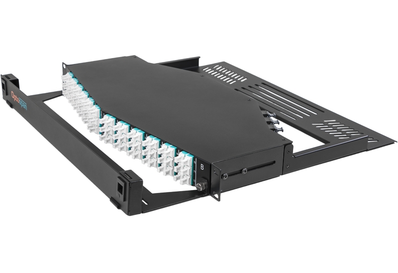 OptoSpan 1U MTP Patch Panel for quick deployment. This high density Single-mode Angled MTP Patch Panel offers 96 LC ports (24 Quad LC) front and 4 Low Loss MTP Elite (24 Fiber Connector) Male/Pinned rear ports. Factory configured for Polarity Method A and designed for implementations in 10G/100G networks.